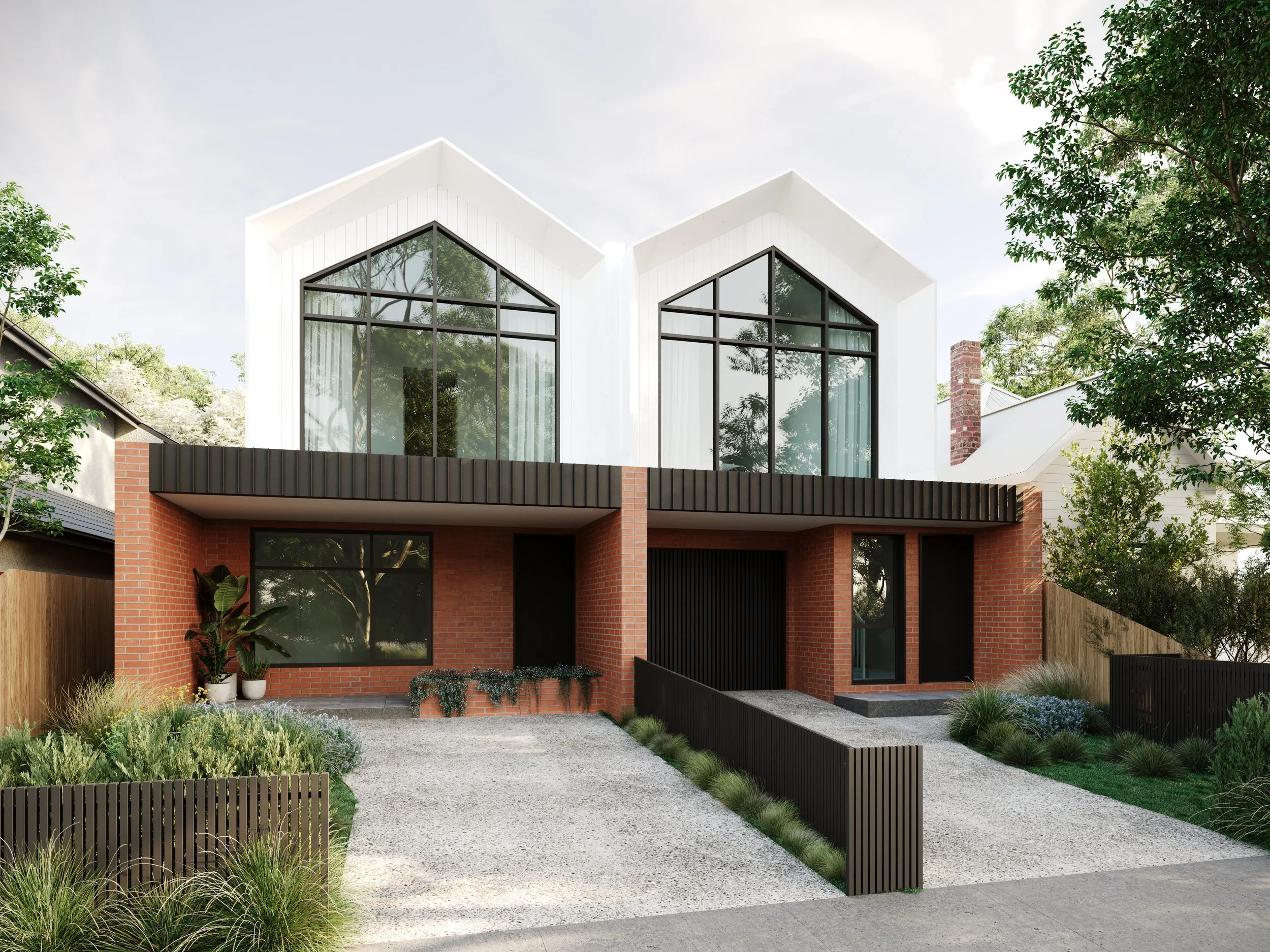This architecturally crafted residence is defined by twin gabled silhouettes that ascend above a solid base of warm red brick.